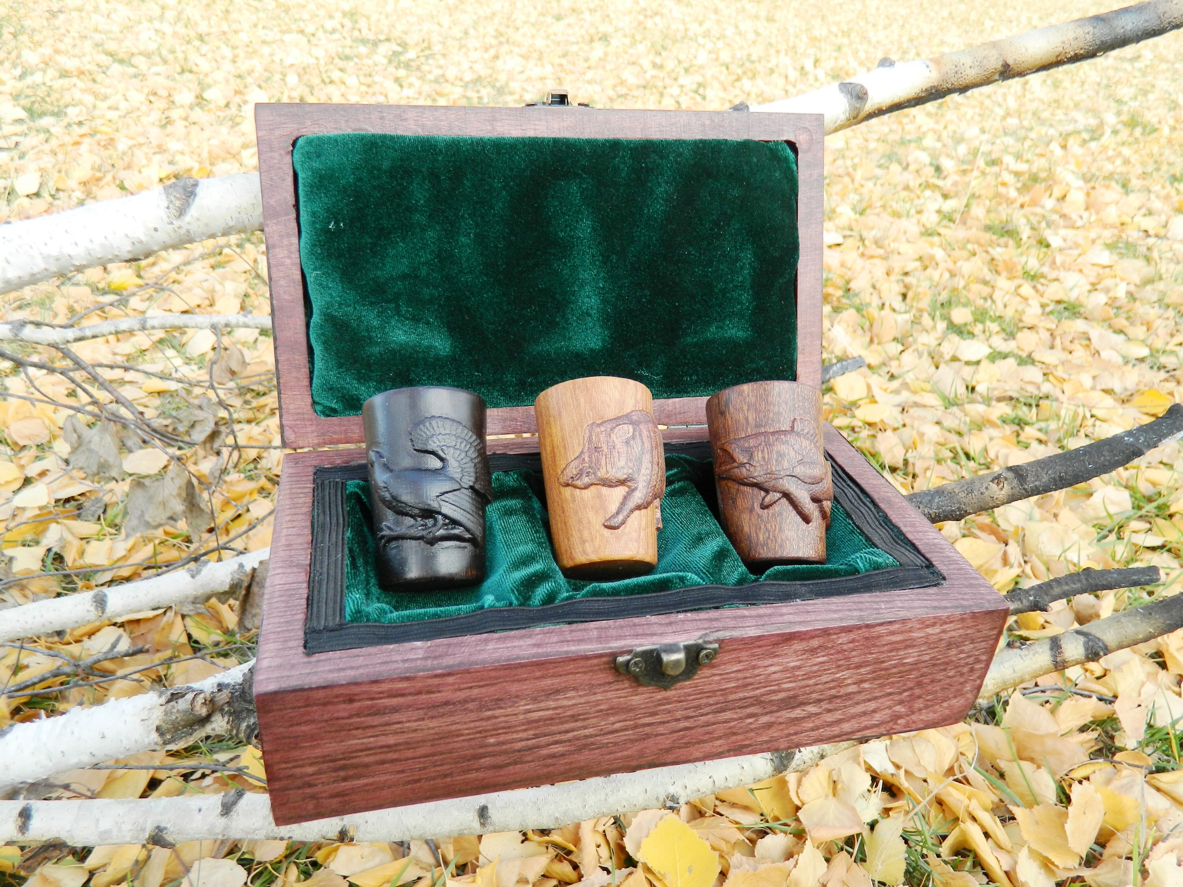 Рюмки изготовлены из трех разных деревьев: дуб, красное дерево и черное дерево.